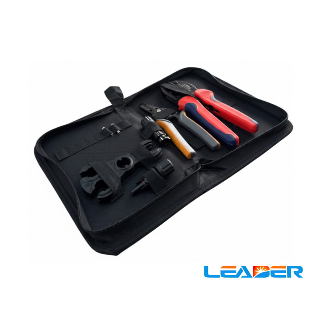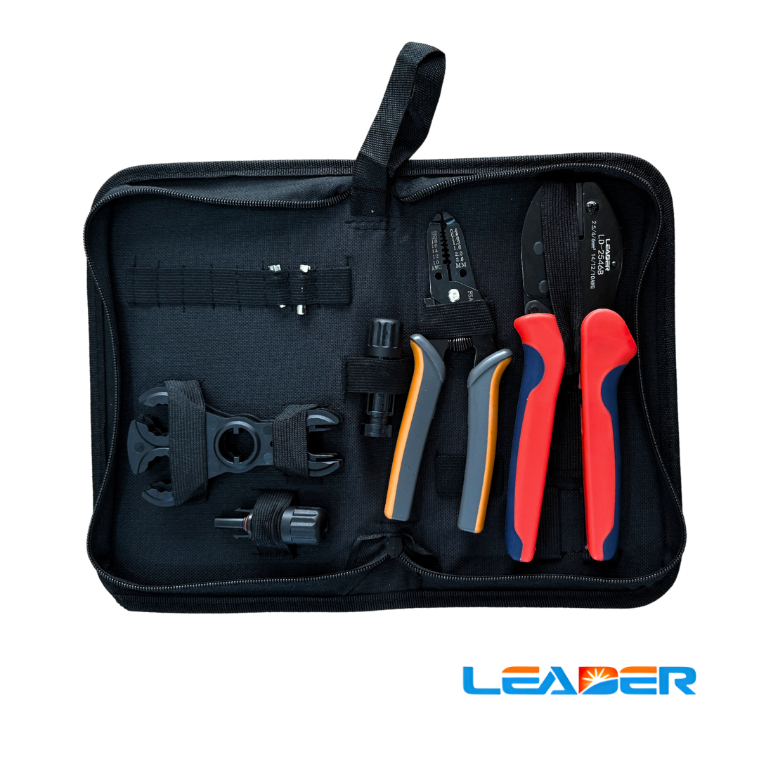 El kit de herramientas de cimprado de la marca LEADER, ofrecida por ECOZAQUE INGENIERÍA SAS, es una herramienta profesional para la instalación y el reemplazo de conectores fotovoltaicos. Incluye alicates, crimpadoras, pelacables, llaves inglesas y un par de conectores fotovoltaicos.